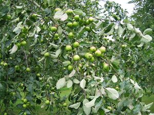 Nach der Ernte verfärben sich die Blätter der Apfelbäume, da der grüne Farbstoff der Blätter abgebaut wird. Jene gelben und roten Farbstoffe in den Blättern, die sonst überdeckt werden, leuchten nun. Im Spätherbst vertrocknet das Laub und fällt vom Baum.