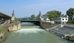 Über das Wehr liegt eine Brücke. (siehe Schemerlbrücke)