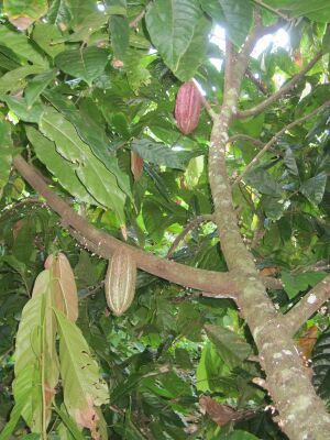 Die Früchte des Kakaobaumes sind etwa 15 bis 20 Zentimeter lang und, sobald sie reif sind, gelb gefärbt. Sie können bis zu ½ kg wiegen.