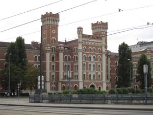 Auffällig ist die aus roten Ziegeln erbaute Roßauer Kaserne.