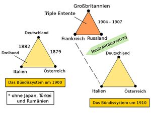 Die anderen Mächte Europas fühlten sich durch das Deutsche Reich bedroht und verbündeten sich miteinander. Lediglich Österreich-Ungarn stand weiterhin zum Deutschen Reich. Doch dort gab es bereits Spannungen innerhalb der verschiedenen Völker.