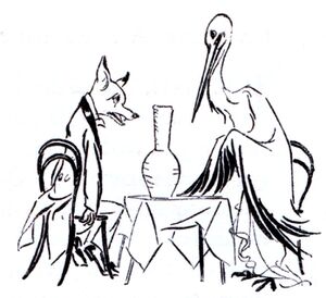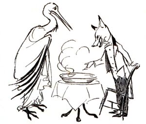 Eines Tages hatte der Fuchs den Storch zum Mittagessen eingeladen. Es gab nur eine Suppe, die der Fuchs seinem Gast auf einem Teller vorsetzte. Von dem flachen Teller aber konnte der Storch mit seinem langen Schnabel nichts aufnehmen. Der listige Fuchs indessen schlappte alles in einem Augenblick weg.