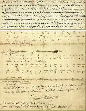 Ein verschlüsselter Brief und darunter die die Entschlüsselung. - Thomas Phelippes and Anthony Babington commons.wikimedia.org, CC0 1.0