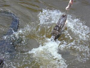 Krokodilfarmen sind aber auch eine Touristenattraktion. Die dort gezogenen Tiere werden schon früh an den Menschen gewöhnt und für Vorführungen dressiert. Trotzdem kommt es in solchen Farmen immer wieder zu folgenschweren Unfällen, denn Krokodile sind wirklich gefährlich.