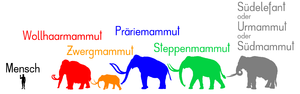 Größenvergleich der verschiedenen Mammutarten und dem Menschen - FunkMonk commons.wikimedia.org, CC BY-SA 3.0