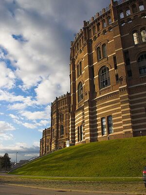 Durch die runde Bauform sind die mittlerweile umgebauten Gasometer sehr auffällig.