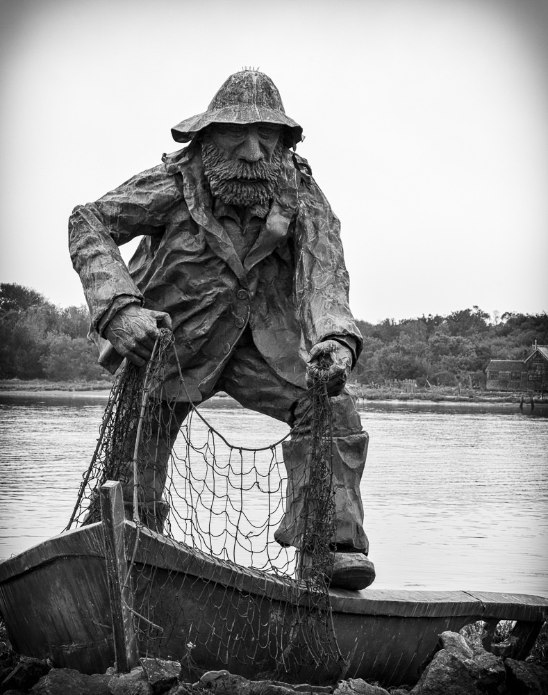 Originaltitel Statue of a Fisherman: A statue of a fisherman hauling in a cod is at the airport end of the bridge at Sisimiut, Greenland.