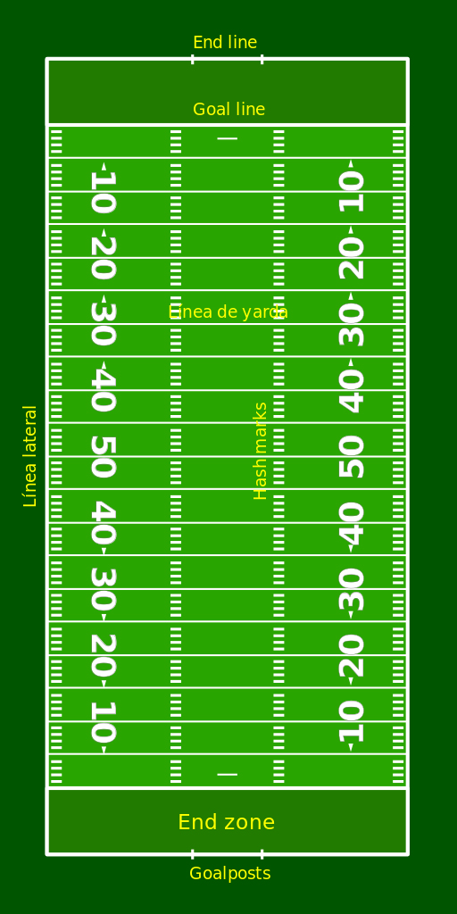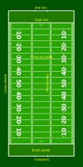 | Beschreibung | Die Markierungen erinnern ein wenig an ein Lineal. Die Inneren 100 Yards sind alle 5 Yards mit einer Querlinie unterteilt. Die zwei mittigen Reihen von kurzen Strichen sind die "hash marks". |
