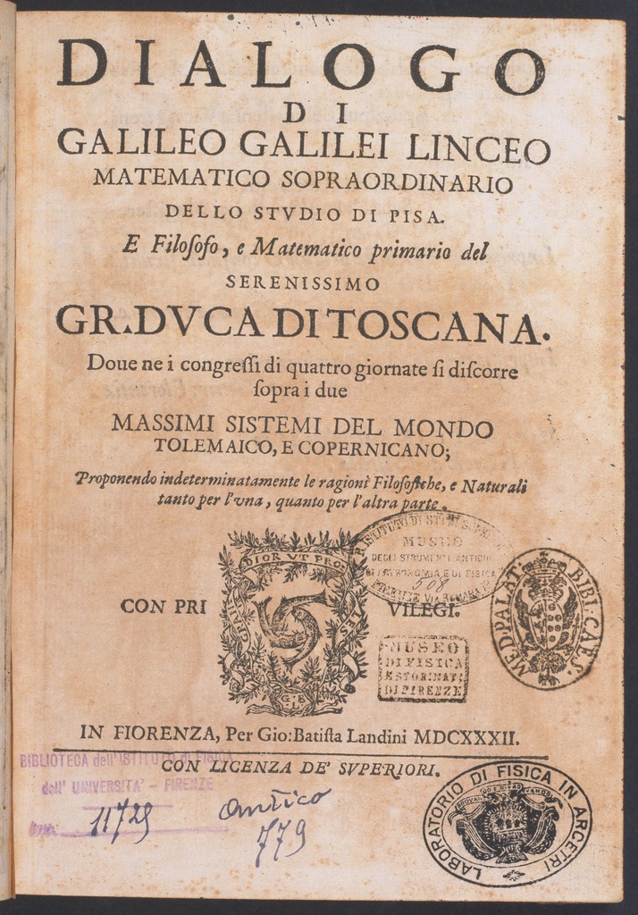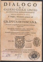 | Beschreibung | Dialogo di Galileo Galilei sopra i due Massimi Sistemi del Mondo Tolemaico e Copernicano (Dialog von Galileo Galilei über die zwei wichtigsten Weltsysteme, das ptolemäische und das kopernikanische). |