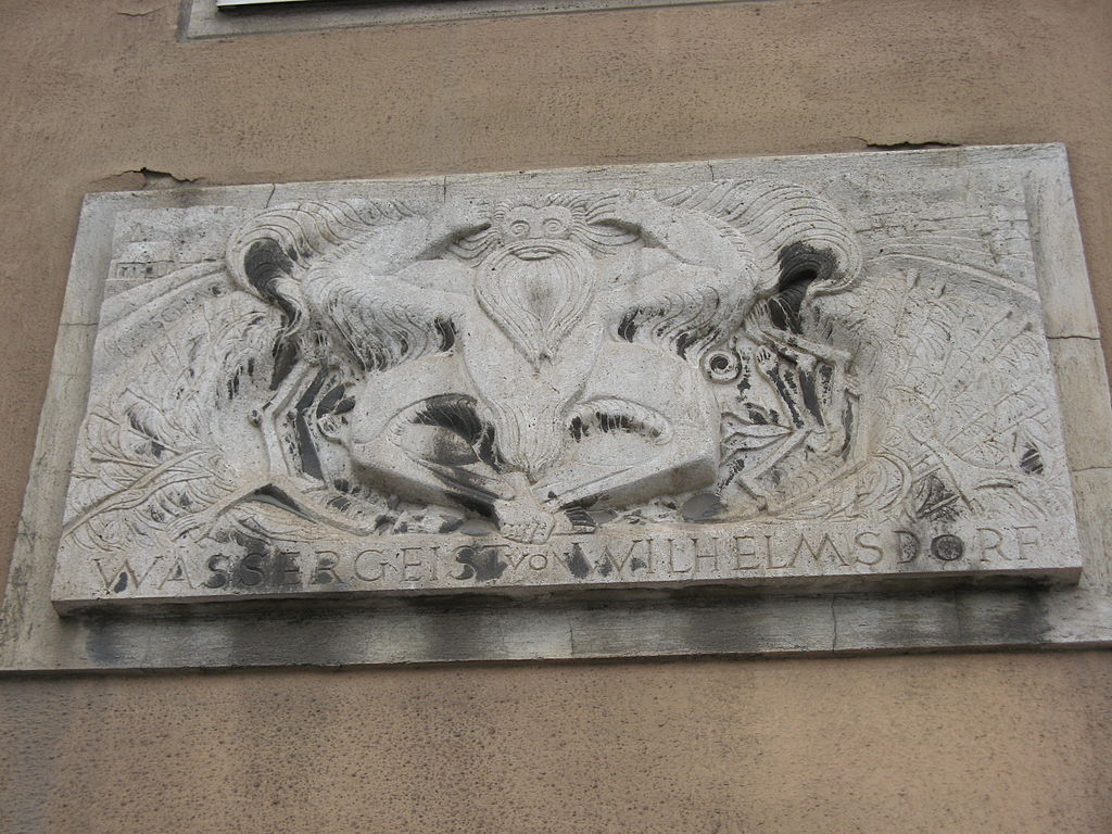 Beschreibung Eine Erinnerungstafel an den Wassergeist von Wilhelmsdorf an der Fasade des Hauses Eichenstraße 50-52 im 12. Bezirk in Wien.