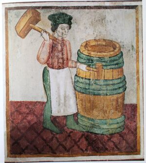 Binder werden auch Fassbinder, Küfner oder Böttcher genannt. Auf dem Bild hält er einen Binderschlegel in der rechten Hand. - Christoforo and Nicolao Seregno [1], CC0 1.0