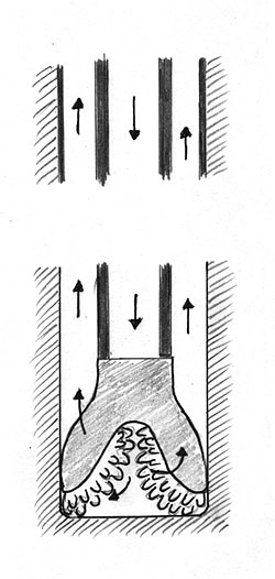 Damit das erbohrte Gestein nach oben gelangt und das Bohrloch nicht gleich wieder verstopft, wird ständig mit Wasser und Mineralien gespült.