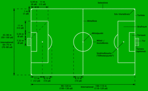 Die Größe des Spielfeldes liegt üblicherweise bei 70 mal 105 Meter. Die Länge kann jedoch auch zwischen 90 und 120 Meter, die Breite zwischen 45 und 90 Meter variieren.