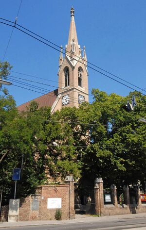 Die evangelische Kreuzkirche wurde im Oktober 1931 eingeweiht. Sie ist nicht direkt als Kirche erkennbar. Denn das Toleranzpatent des Kaiser Josef II. von 1781 genehmigte evangelischen Christen zwar den Bau und Betrieb von Kirchen. Eine Bedingung sah vor, dass sie nicht wie eine solche aussehen durfte.