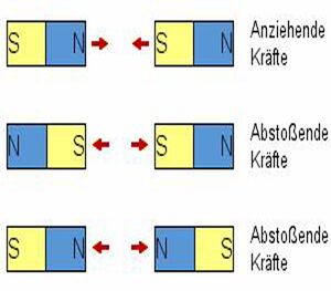 Wenn ein Magnet zerbrochen wird, entstehen zwei neue Magnete mit wieder jeweils zwei Polen. Zwischen den Polen zweier Magneten arbeiten eigene Kräfte. Es gilt immer: Gleichartige Pole stoßen sich ab, verschiedenartige ziehen einander an.