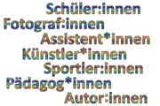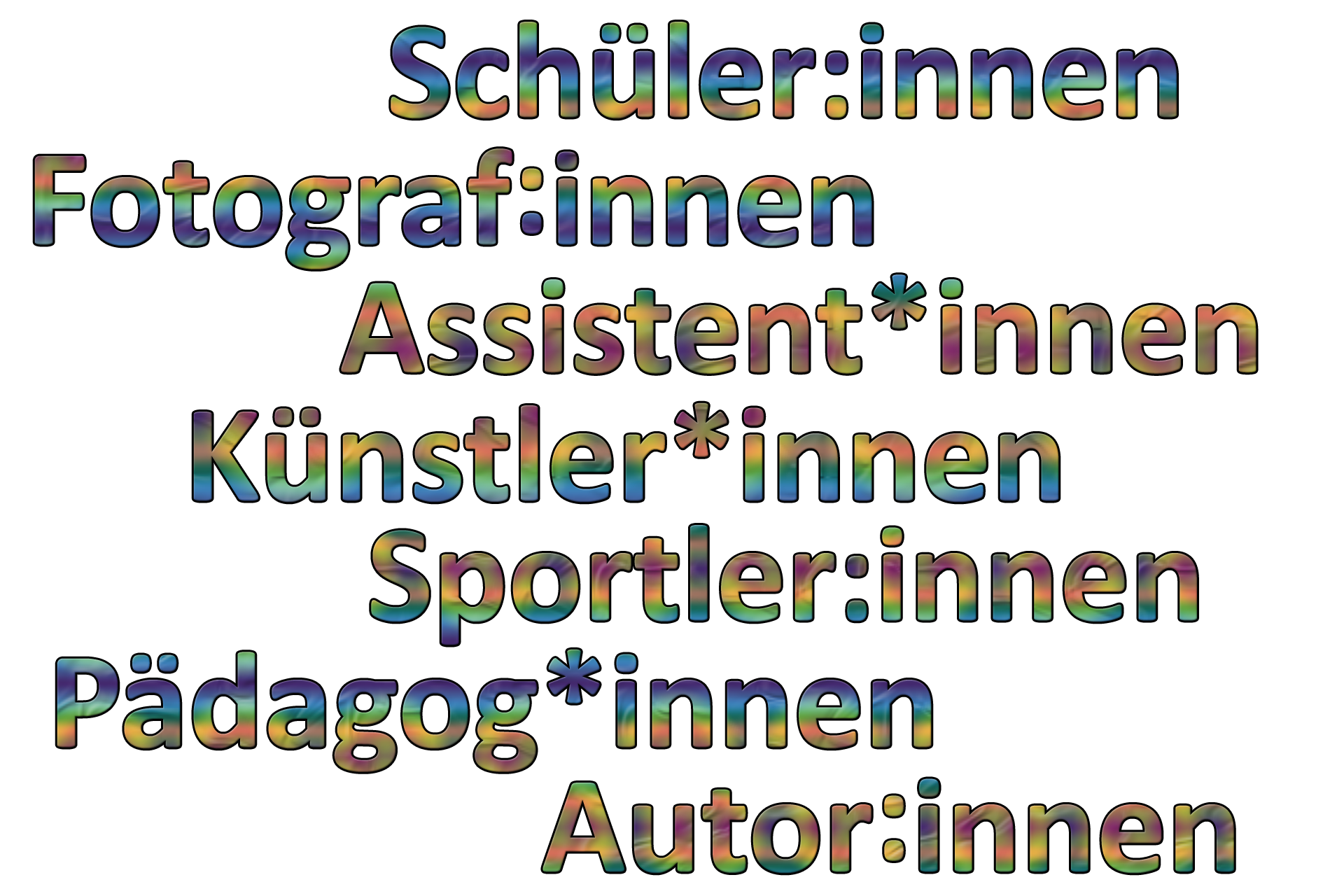 | 10:36, 5. Apr. 2022 | Gender Doppelpunkt Sternchen innen.png (Datei) | 1,56 MB | Gudrun | {{Bildinformationen | Beschreibung = Bitte bearbeite mich und fülle die Bildinfos aus! | Urheber = | Herausgeber = | QuelleText = | QuelleUrl = | LizenzText = | LizenzUrl = | Originaltitel = | Bearbeitung = | GeoLand = | GeoRegion = | GeoGPSNorth = |… | 1 | |