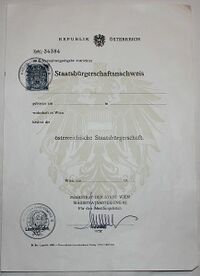 |Bilder=[[Datei:Staatsbürgerschaftsnachweis.jpg|thumb|200px|center|Die Österreichische Staatsbürgerschaft bestätigt unter anderem das Wahlrecht.]]}} | |Bilder=[[Datei:Staatsbürgerschaftsnachweis.jpg|thumb|200px|center|Die Österreichische Staatsbürgerschaft bestätigt unter anderem das Wahlrecht.]]}} | ||