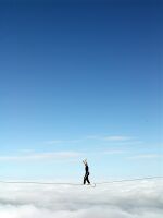 Hier wird die Slackline in großer Höhe angebracht. Das sieht zwar sehr toll und beeindruckend aus, doch ohne eine Absicherung wäre es sehr gefährlich. Deshalb sind Slackliner die über eine Highline gehen immer mit einem Klettergurt abgesichert.