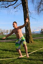 Leider wird es dadurch nicht einfacher. Das Band wird nämlich nicht ganz straff gespannt und deshalb bewegt es sich stärker als ein Seil. Es ist eine Herausforderung, das Gleichgewicht zu halten.