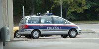 Österreichische Fahrzeuge der Polizei erkennt man an der weißen Aufschrift "Polizei" und an der blau-roten und silbernen Lackierung.