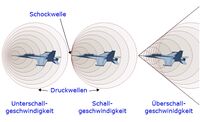 Beschleunigt das Flugzeug jetzt noch weiter – also mit Überschallgeschwindigkeit – fliegt es durch die Schockwelle und überholt sie. Die sogenannte Schallmauer wird durchbrochen. Das ist dann als Überschallknall zu hören.