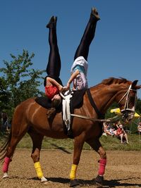 Beim Voltigieren geht es darum, unterschiedliche Turnübungen am Pferd auszuführen. Das Pferd bewegt sich dabei in den Gangarten Schritt, Trab oder Galopp. Zum Voltigieren gehört aber auch das Aufspringen auf das Pferd und abschließend der Absprung vom Pferd.