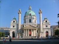 Der Bau der Karlskirche (1715-1737) wurde von Vater Fischer von Erlach begonnen und von seinem Sohn vollendet. Besonders auffällig sind die beiden Säulen.