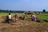 Nach ungefähr vier bis sechs Monaten kann der Reis geerntet werden. Dafür werden die Felder trocken gelegt. Anschließend werden die Halme mit einer Sichel geschnitten und zum Trocknen direkt auf die nun trockenen Felder gelegt. Zum Schluss werden die Halme gebündelt und gedroschen.