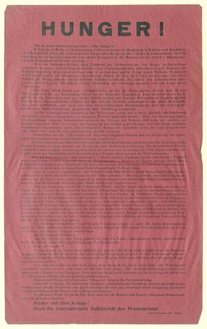 [[Datei:Plakat Hunger D.jpeg|thumb|300px|right|{{ImageCaption|Titel= Hunger! Nieder mit dem Kriege!