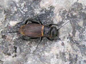 | Besondere Merkmale | glänzend schwarz; hören mit den Ohren; nur die Männchen zirpen |