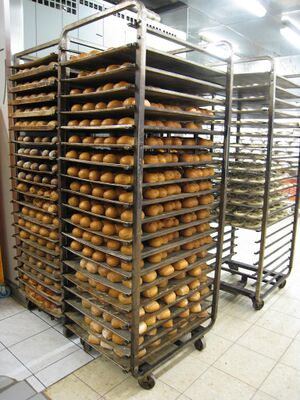 In der Großbäckerei ist die Produktion automatisiert. Hier berechnet ein Computer nach Eingabe der Gebäcksorte und –menge wieviel Mehl benötigt wird. Aus einem Silo wird es durch Rohre zur Teigbereitung geleitet. Nur die speziellen Zutaten für die jeweilige Backware werden mit der Hand dazugegeben. Ab nun regiert wieder die Maschine bis das Backwerk fertig verpackt verladen werden kann.