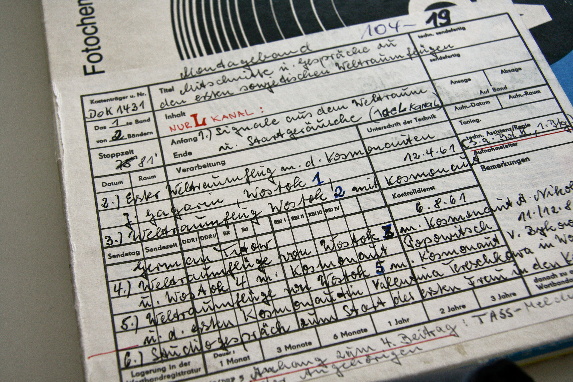 14:16, 1. Okt. 2016 Archivband über Gagarins Weltraumflug 1961.jpg (Datei) 615 KB {{ImageMetaTable|Beschreibung=Verpackung des Tonbandes mit der Sendung des Rundfunks der DDR über Gagarins Weltraumflug 1961|Urheber=Maximilian Schönherr|Herausgeber=commons.wikimedia.org|Quelle={{ImageMetaSource|Quelle=https://commons.wikimedia.org/… 1