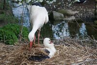 Nach der Paarung legt das Weibchen zwischen drei und fünf weiße Eiern. Etwa ein Monat nach der Eiablage schlüpfen die Storchenbabys.