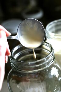 - Zugabe von Bakterienkulturen und organischer Stoffe aus Kälbermägen (= Lab)