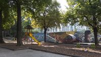 In diesem Park gibt es einen großen Spielplatz, einen Sportplatz und eine Skateanlage.