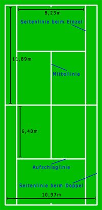 Die Abmessungen des Spielfeldes sind im Freien wie in der Halle gleich. Das Spielfeld ist ein Rechteck mit 23,77 Meter Länge. Die Breite beträgt beim Einzel 8,23 und beim Doppel 10,97 Meter. Die Linien, die den Platz am Ende und an den Seiten begrenzen, werden als Grund- bzw. Seitenlinien bezeichnet. Die beiden Spielhälften werden durch das Netz getrennt. Das Netz ist in der Mitte des Platzes 91,4cm und außen 107cm hoch. Zusätzlich gibt es vier Aufschlagfelder, die durch die Aufschlaglinie (auf beiden Seiten des Platzes 6,40m vom Netz entfernt) und die Mittellinie begrenzt werden. Alle Linien zählen zum Spielfeld und sind weißer Farbe. Springt ein Ball auf einer Linie auf, gilt er als in den Teil des Platzes gespielt, den die Linie begrenzt. Also erst wenn der ganze Ball außerhalb des Spielfeldes bzw. der Linie aufspringt, ist er aus bzw. out.