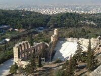 Aber erst die Griechen legten die Grundsteine unseres heutigen Theaters. Sie bauten das Theatron (Schaustätte, Theater). Es war ein so genannter Zuschauerraum. Hier fanden in den Anfangszeiten hauptsächlich politische Diskussionen und religiöse Feste statt. Die religiösen Feste waren meistens Dionysien, also Festspiele, die für den Gott Dionysos gefeiert wurden. Dionysos war übrigens der Gott des Weines. Diese Feste bestanden aus allerlei Gesangs-, Tanz- und Opferritualen. Aus den Dionysien entwickelten sich später die griechische Tragödie und schließlich die Komödie.