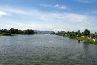 | Beschreibung | Neue Donau und Donauinsel (links)- Wasserskilift im Vordergrund - Blick stromaufwärts - Wasserskilift |